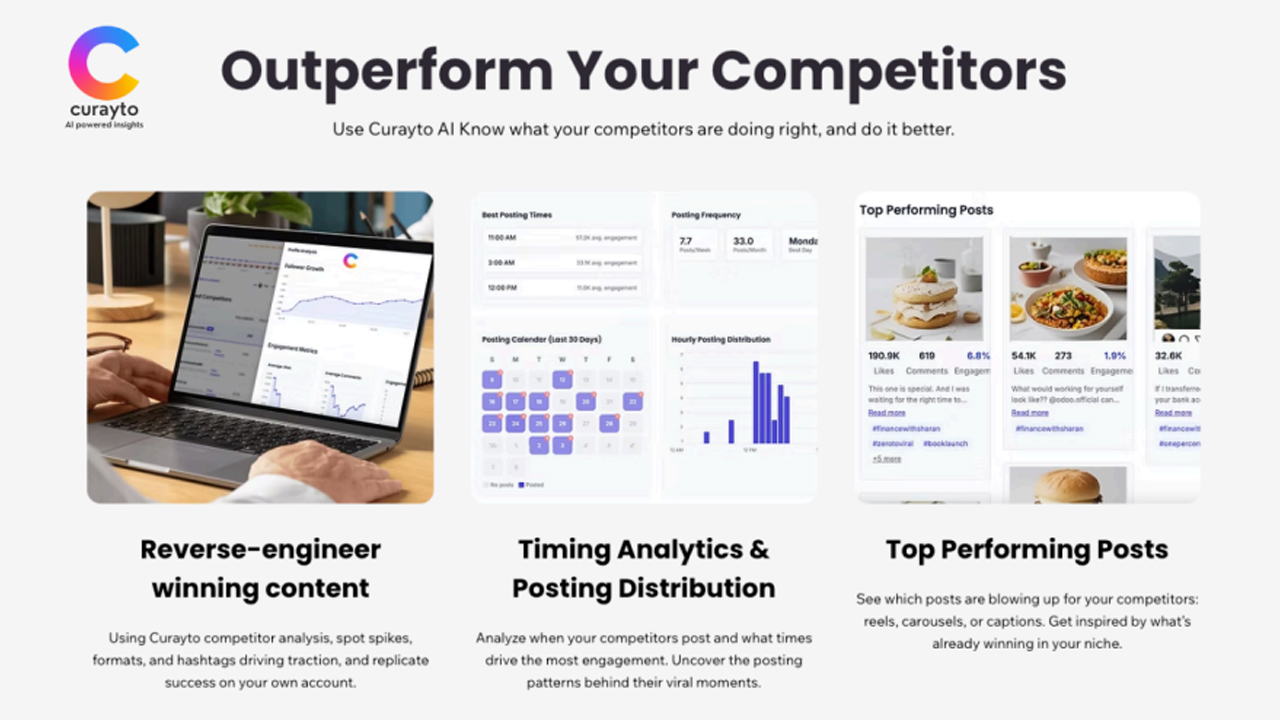 ● Monday morning: You open Curayto and it’s already tracked your top five competitors. It flags that carousels with a “before/after” first slide and a short, curiosity‑driven caption are outperforming in your niche this week.