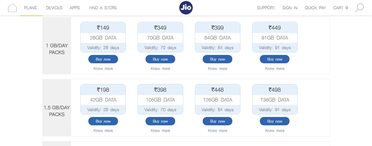 Reliance Jio also revised its existing Rs. 198, Rs. 398, Rs. 448 and Rs. 498 prepaid plans. These now offer 1.5GB of high-speed 4G per day data with different validity period.